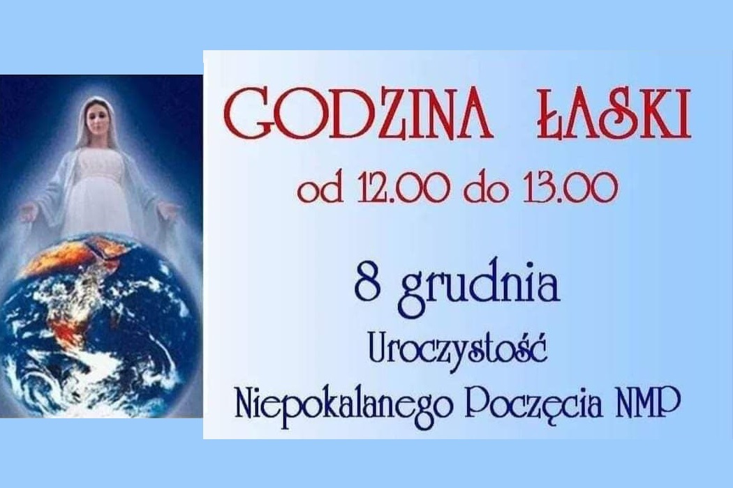 Jest taka godzina w ciągu roku, gdy Niebo otwiera się szeroko dla każdego człowieka. Przez 60 minut na świat wylewają się fale łask. W tej godzinie nawrócić się może nawet najbardziej zatwardziały grzesznik. Ta godzina, to GODZINA ŁASKI, która jest wyjątkowym prezentem dla ludzkości od Niepokalanej. Przypada 8 grudnia o godz. 12.00.