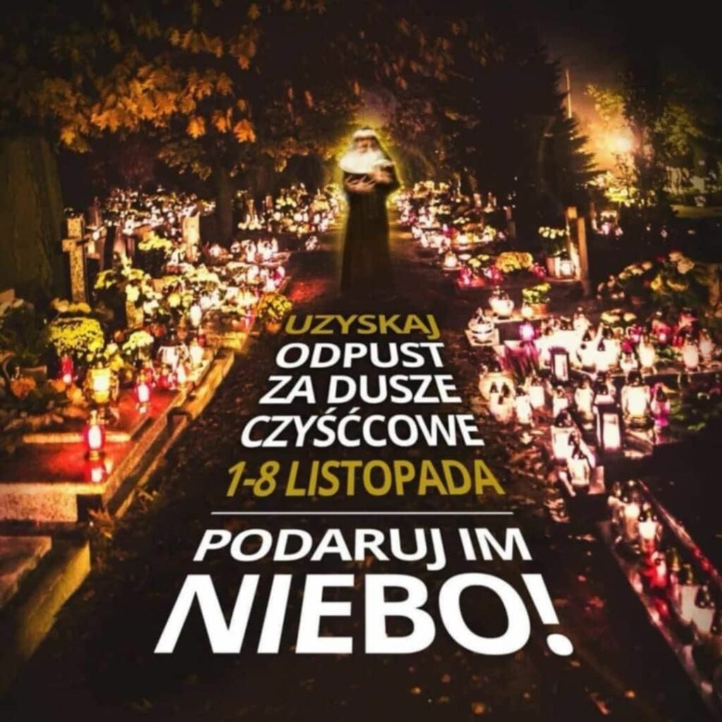 1. Wierni, którzy nawiedzą kościół, kaplicę publiczną, lub półpubliczną 1 listopada od południa i przez cały Dzień Zaduszny, mogą dostąpić odpustu zupełnego za zmarłych. Można go uzyskać tylko jeden raz w ciągu dnia.